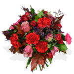 oak leaves - 3 pcs hot pink carnations - 6 pcs red carnations - 6 pcs red spray roses - 4 pcs vintage roses - 4 pcs