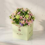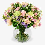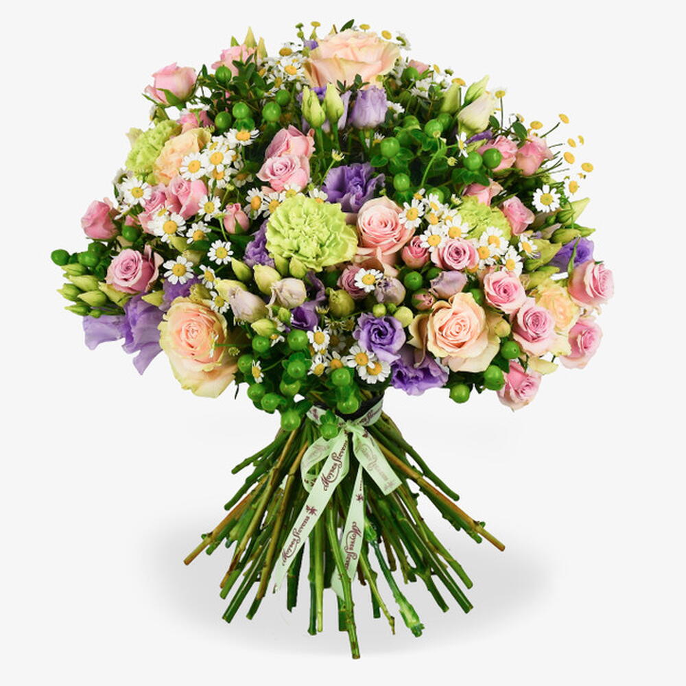 Bring the carefree spirit of a summer meadow indoors with Chamomile Charm. This delightful hand-tied arrangement is defined by the cheerful, daisy-like faces of fresh chamomile, woven through a soft palette of blush pink spray roses and lavender lisianthus. We’ve added lime-green carnations and glossy green hypericum berries to create a lush, textural foundation that feels both youthful and sophisticated. It is a lighthearted, botanical masterpiece designed to brighten any corner with its natural, just-picked elegance.