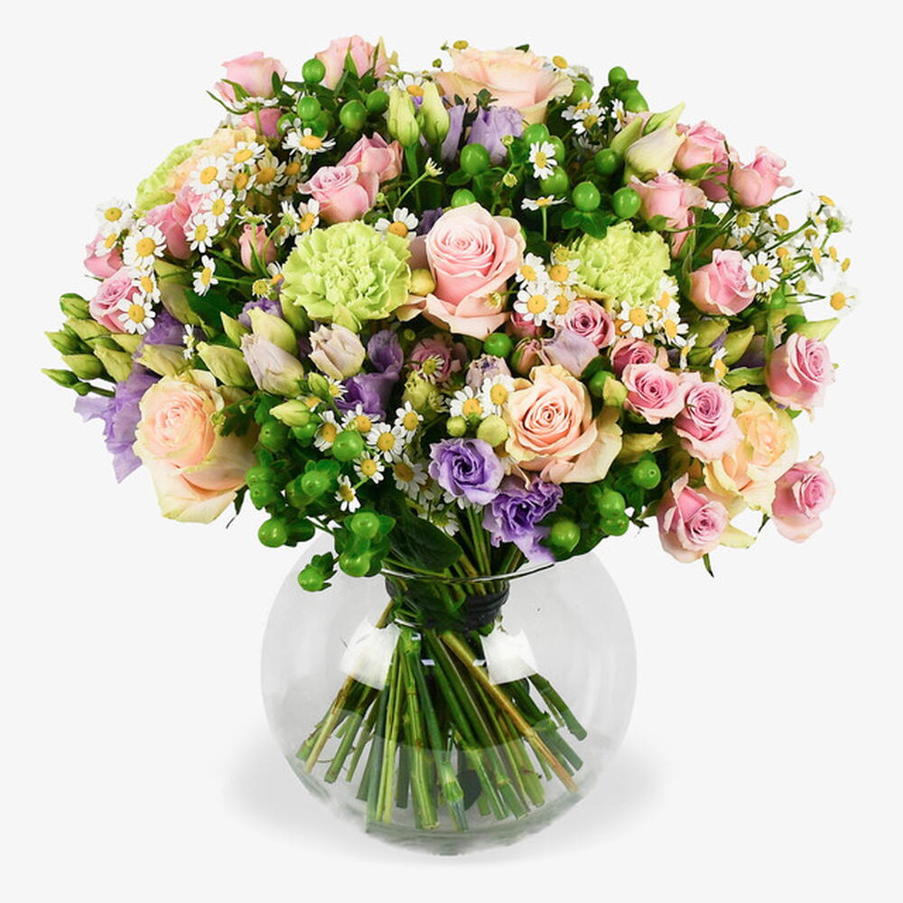 Lisianthus - 5 pcs chamomile - 5 pcs carnations - 7 pcs hypericum - 7 pcs roses - 7 pcs spray roses - 7 pcs seasonal foliage (bunch) - 1 pcs