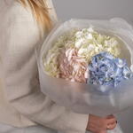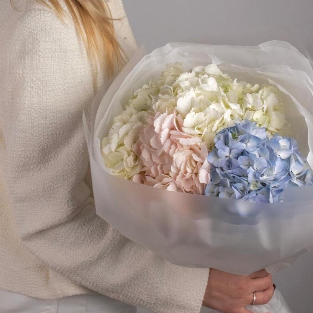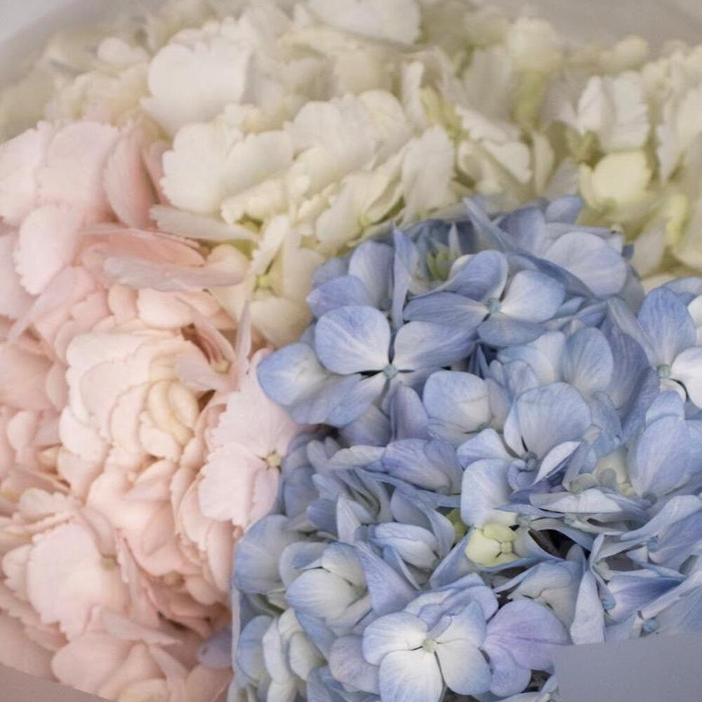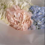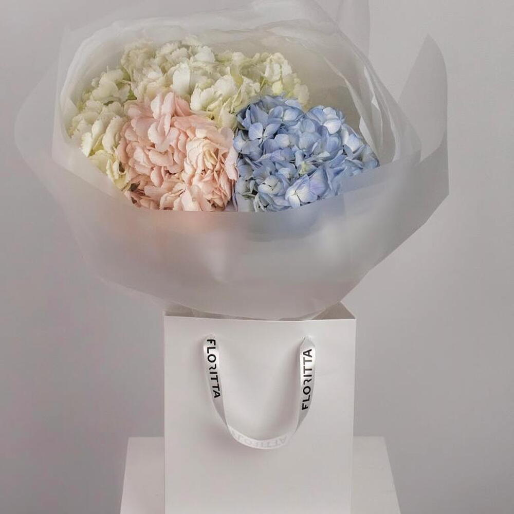 A delicate pastel bouquet featuring three premium hydrangea heads in soft blush, blue and cream tones. Elegant, airy and perfect for birthdays, romantic occasions or as a charming gift. Light pastel colours make this bouquet feel truly sophisticated and uplifting.