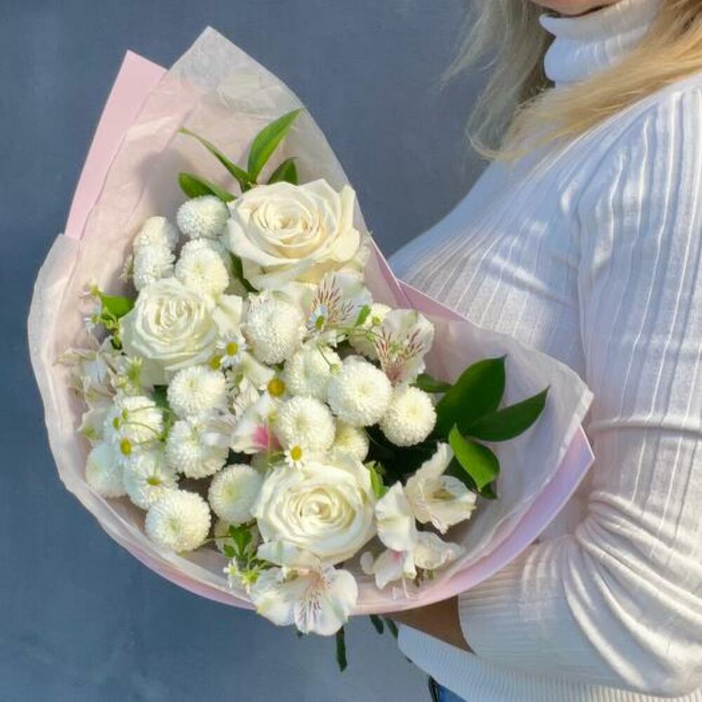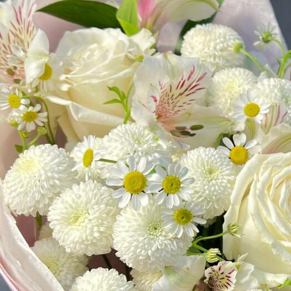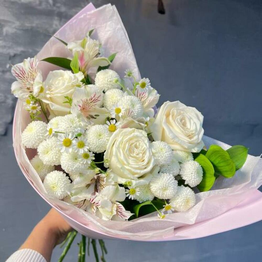 Satin ribbon - 1 pcs Alstroemeria - 3 pcs tanacetum - 2 pcs design packaging - 1 pcs santini white - 3 pcs peony roses ecuador - 3 pcs