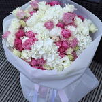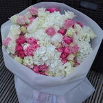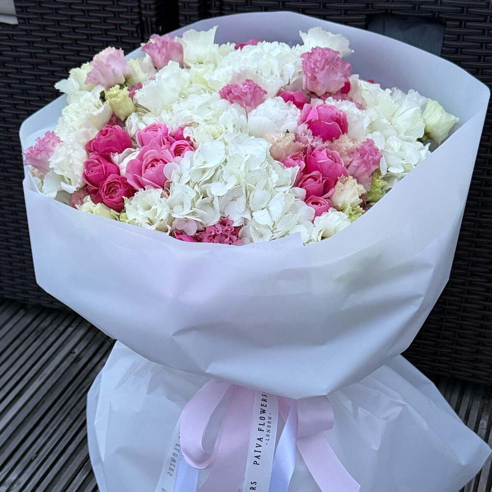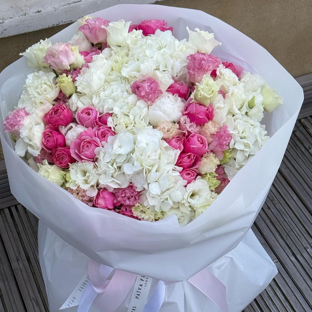 lisianthus white - 10 pcs peony white - 2 pcs hydrangeas white - 5 pcs roses bombastik - 10 pcs lisiantus pink - 10 pcs