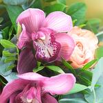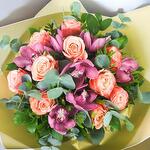 “Coffee Satin” is a luxurious bouquet that blends earthy elegance with exotic beauty. Featuring large-headed peach roses paired with deep burgundy cymbidium orchids, this hand-tied arrangement is rich in tone and texture. Set against a backdrop of wild eucalyptus and fresh green foliage, it’s the perfect floral gift to express warmth, class, and sophistication. Whether youre celebrating a birthday, sending love, or elevating your space, Coffee Satin delivers timeless floral artistry. Care Instructions: Keep the arrangement in a cool spot away from heat and direct sunlight. Check water levels daily and top up to keep stems hydrated. You may trim the ends of the stems at an angle every couple of days to prolong freshness. Orchids can be delicate, so handle gently when repositioning.
