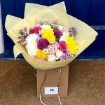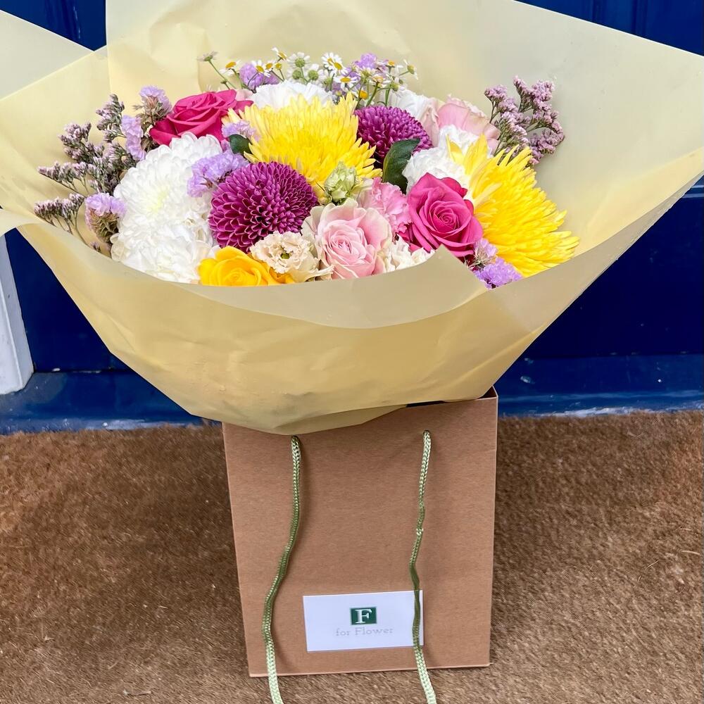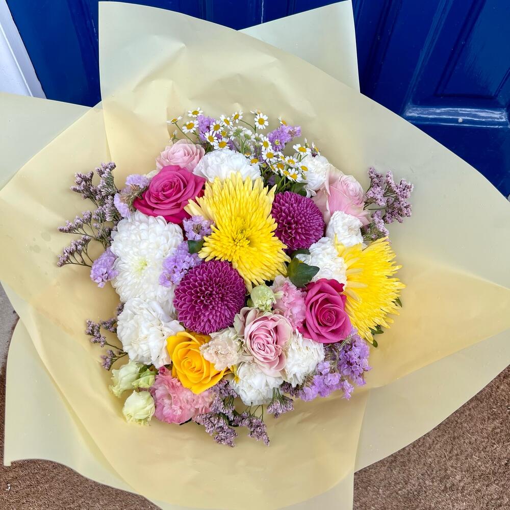Introducing the Colourful bouquet with Pink rose, Yellow rose, White chrysanthemum, Yellow chrysanthemum, Purple chrysanthemums, and Pink lisianthus! This vibrant and cheerful arrangement is bursting with color and energy, making it the perfect gift for any occasion. The Pink and Yellow roses add a touch of romance, while the White, Yellow, and Purple chrysanthemums create a bold and striking contrast. The Pink lisianthus ties it all together, creating a harmonious and beautiful display. Order the Colourful bouquet today and bring a smile to someone's face!