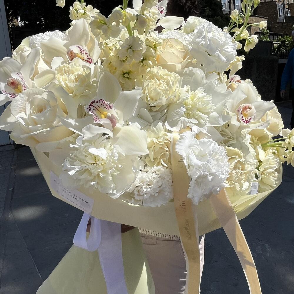 Delight in the exquisite arrangement of our Florists Special, a captivating blend of colors and fragrances. This elegant ensemble includes 10 vibrant carnations, their charm boldly contrasting with the muted elegance of 5 stunningly clustered hydrangeas. The exotic allure of 7 orchid cymbidium adds an element of intrigue, perfectly balanced with the nostalgic allure of 7 fragrant stocks. Finally, 7 classic roses infuse the composition with an enduring appeal. The number and combination of flowers make this arrangement an exceptional addition that can dramatically enhance any setting.