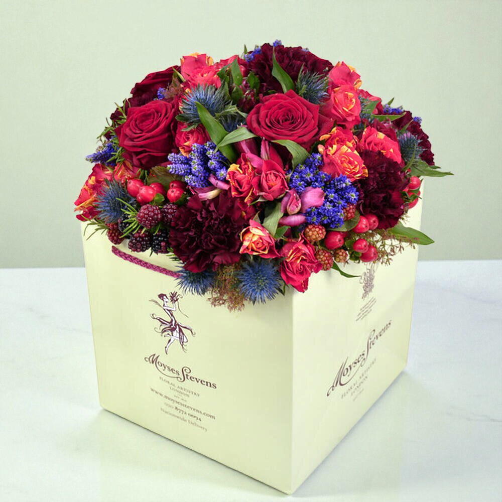 Crimson roses and rich, burgundy carnations make up this dreamy display. Thistles, rubus and scarlett berries are entwined to create this romantic and extravagant bouquet. Finished with fresh rosemary and seasonal greenery, Crimson Dream is an elegant, festive design that would make a perfect gift for somebody special.