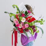 Crimson Garden is a bold, contemporary composition combining expressive textures and vibrant tones. Sculptural anthuriums, delicate garden roses, orchids, and seasonal blooms are layered with airy greenery and natural branches to create movement and depth. Striking and artistic, this bouquet is designed for those who appreciate modern floristry and statement arrangements. Wrapped in premium designer paper and finished with a signature ribbon.