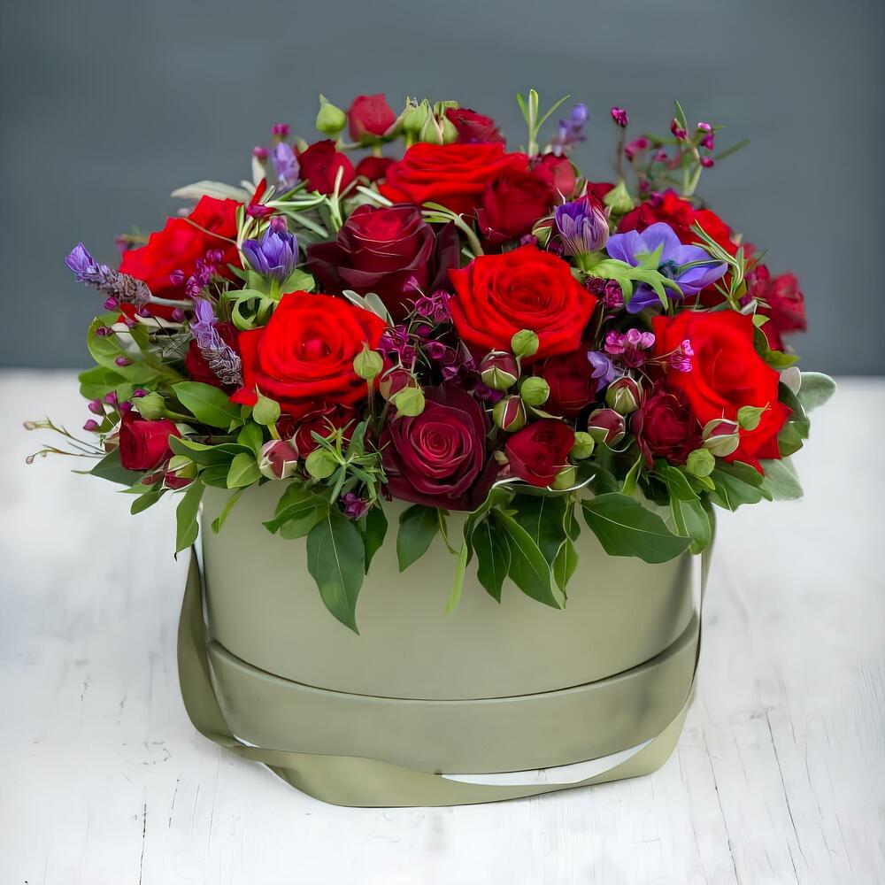 A passionate blend of deep red and burgundy roses complemented by playful purple accents and vibrant greenery. Crimson Symphony is the perfect arrangement to convey deep emotions — from love and admiration to strength and appreciation.