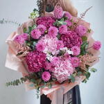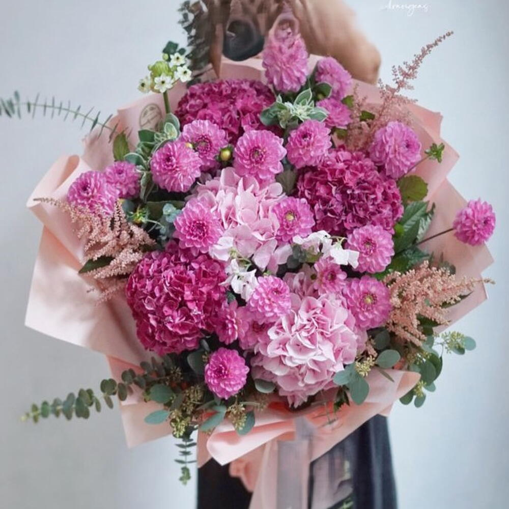 eucalyptus. - 10 pcs pink dahlia - 20 pcs light pink hydrangeas - 3 pcs hot pink hydrangeas - 3 pcs pink astilbe. - 10 pcs