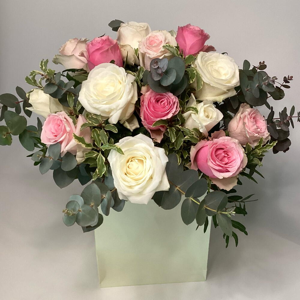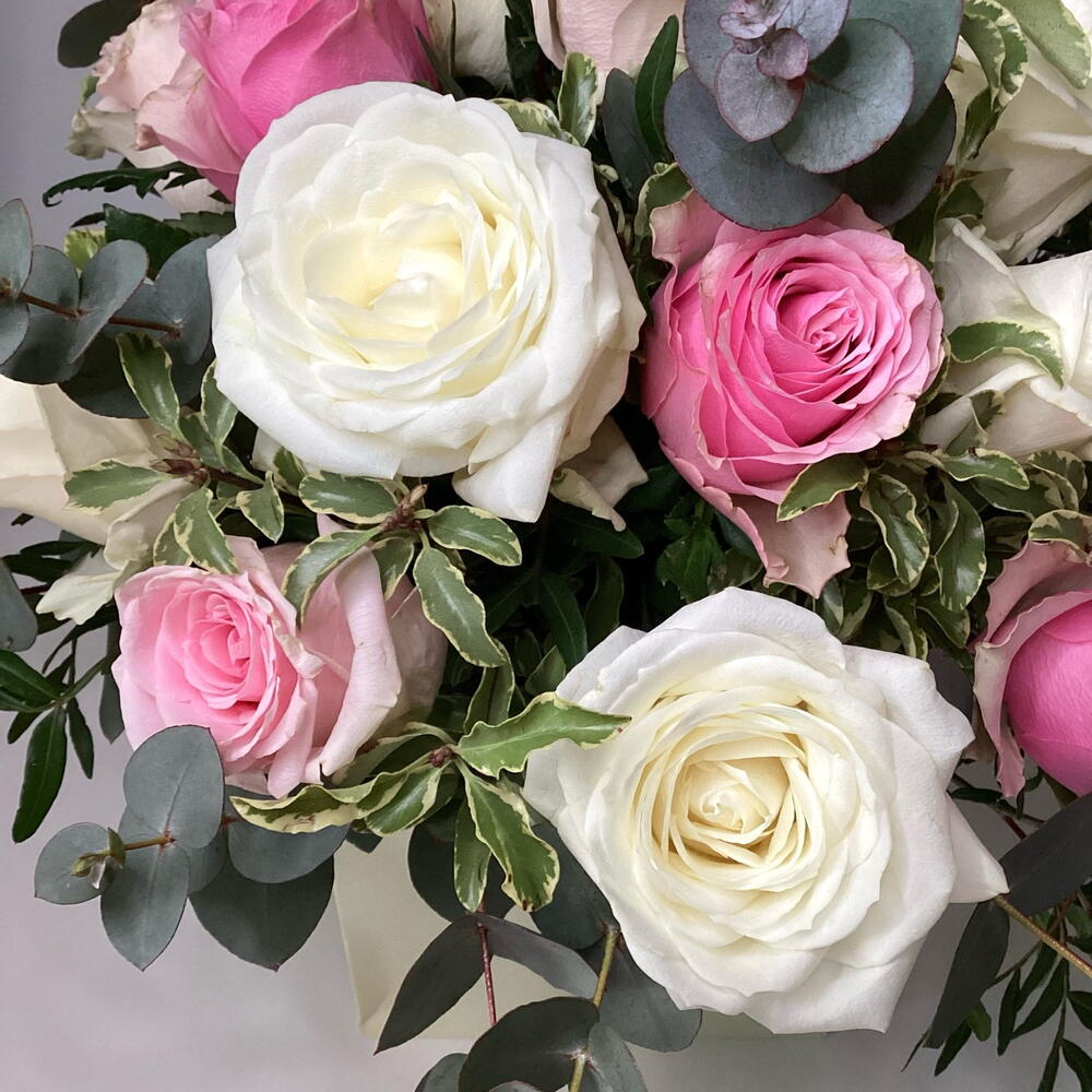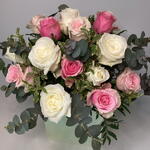 This elegant mono bouquet is a delightful blend of fresh eucalyptus sprigs and sophisticated roses. Its composition features five verdant eucalyptus branches harmoniously entwined with eight romantic pink roses and seven pure white roses. Perfect as a gift, this bouquet radiates charm and grace, making it an ideal choice for any occasion.i