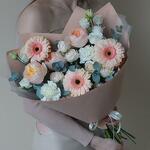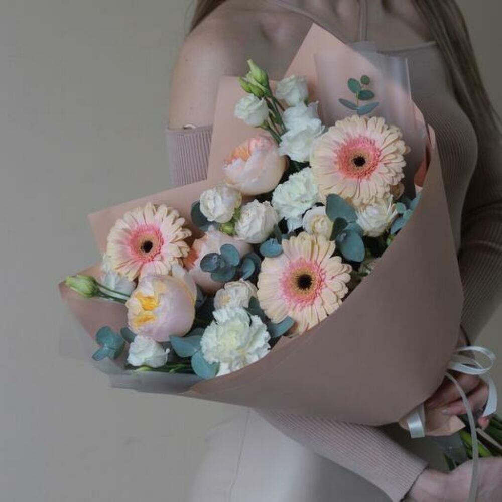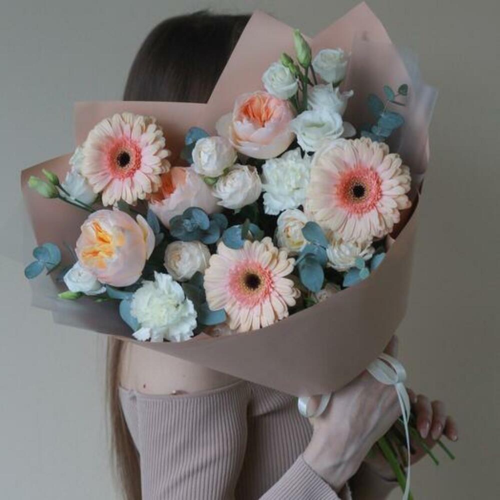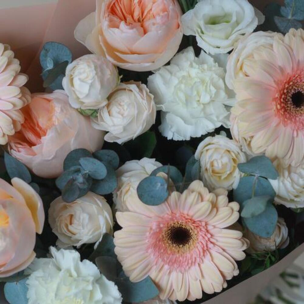 Eucalyptus - 4 pcs Eustoma white - 2 pcs dianthus white - 2 pcs juliet rose - 3 pcs rose bombastic - 2 pcs peach gerbera - 3 pcs