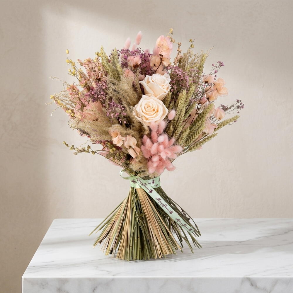 This exquisite bouquet features a harmonious blend of bunny tails, vibrant bougainvillea, golden wheat, and a delightful mix of pink dried flowers and grasses, all complemented by preserved roses.