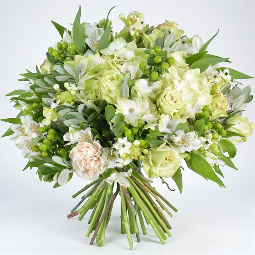 A variation on the classic green and white colour combination, this bouquet is at once elegant and avant-garde, refined and radical. White alstroemeria are offset with cream roses and dusky carnations, highlighted here and there with hypericum berries and flashes of silvery eucalyptus.