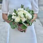 Eucalyptus - 4 pcs white lisianthus - 3 pcs white spray roses - 3 pcs off white avalanche roses - 5 pcs cream roses - 5 pcs pittosporum ralphi - 3 pcs pittosporum variegated - 2 pcs satin ribbon with pin - 1 pcs