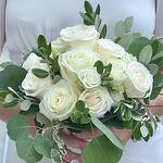 Lovely compact bridal bouquet with delicate large headed roses and smaller spray roses. Pretty foliage added around the roses and tied with a soft satin ribbon.