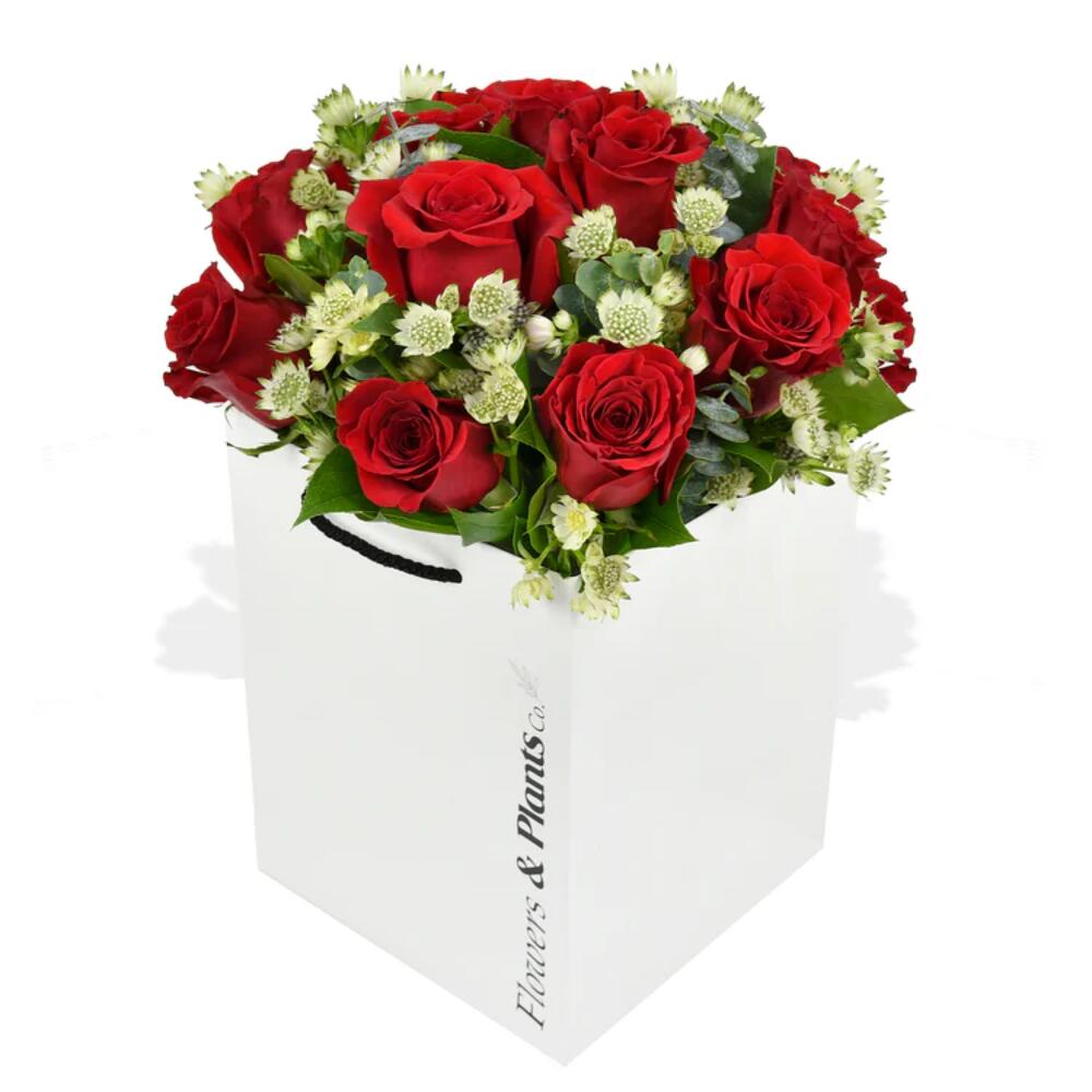 Fall in love with our Elixir of Love, a unique blend of romantic red roses, delicate astrantia, fresh eucalyptus, and lush foliage.