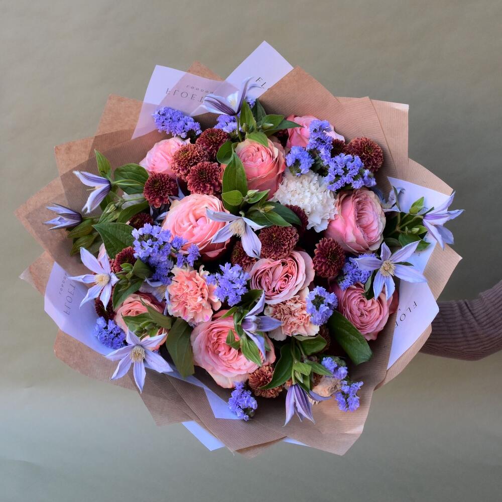 Statice - 4 pcs Ecuadorian rose - 8 pcs Clematis - 5 pcs Pistacia - 3 pcs packaging - 1 pcs dianthus - 4 pcs santini chrysanthemums - 4 pcs
