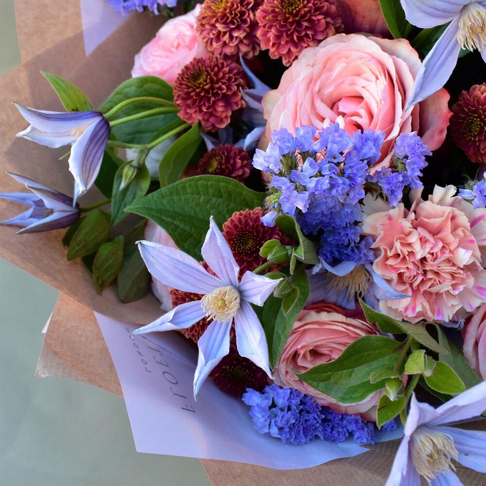 This stunning flower bouquet in peach and lavender offers a garden-inspired look that's perfect for any special occasion. Made with large-headed peachy garden roses, lush chrysanthemum santini, delicate lavender eustoma, textured dianthus, and striking statice, this arrangement is beautifully complemented by the addition of whimsical clematis. With its soft, romantic hues and natural beauty, this bouquet is sure to delight and impress. *Substitution Policy: Due to seasonal availability of certain flowers from time to time, we may use a substitution.