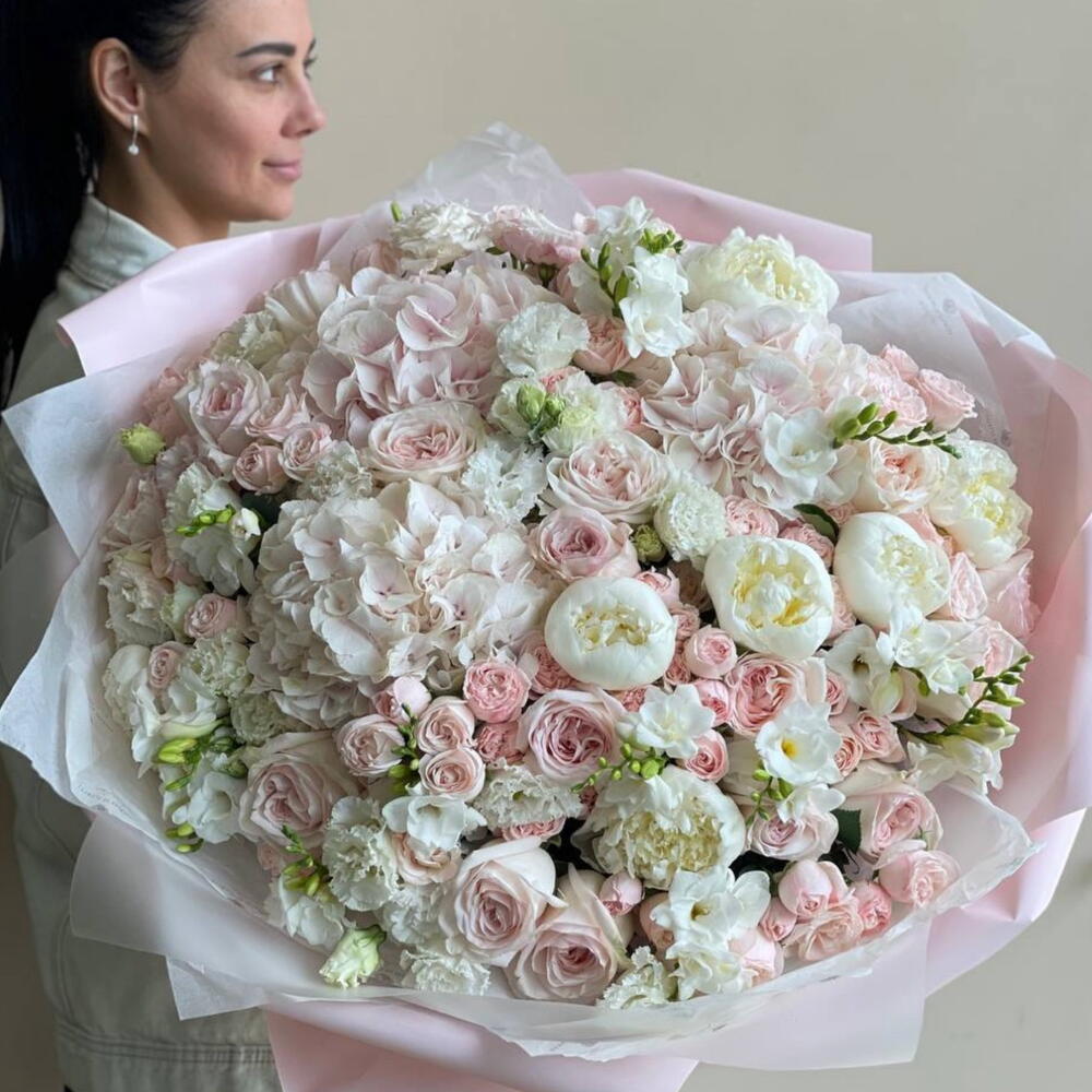 Spray rose - 10 pcs Hydrangea - 10 pcs Lisianthus - 20 pcs white peonies - 10 pcs pink roses - 10 pcs