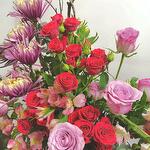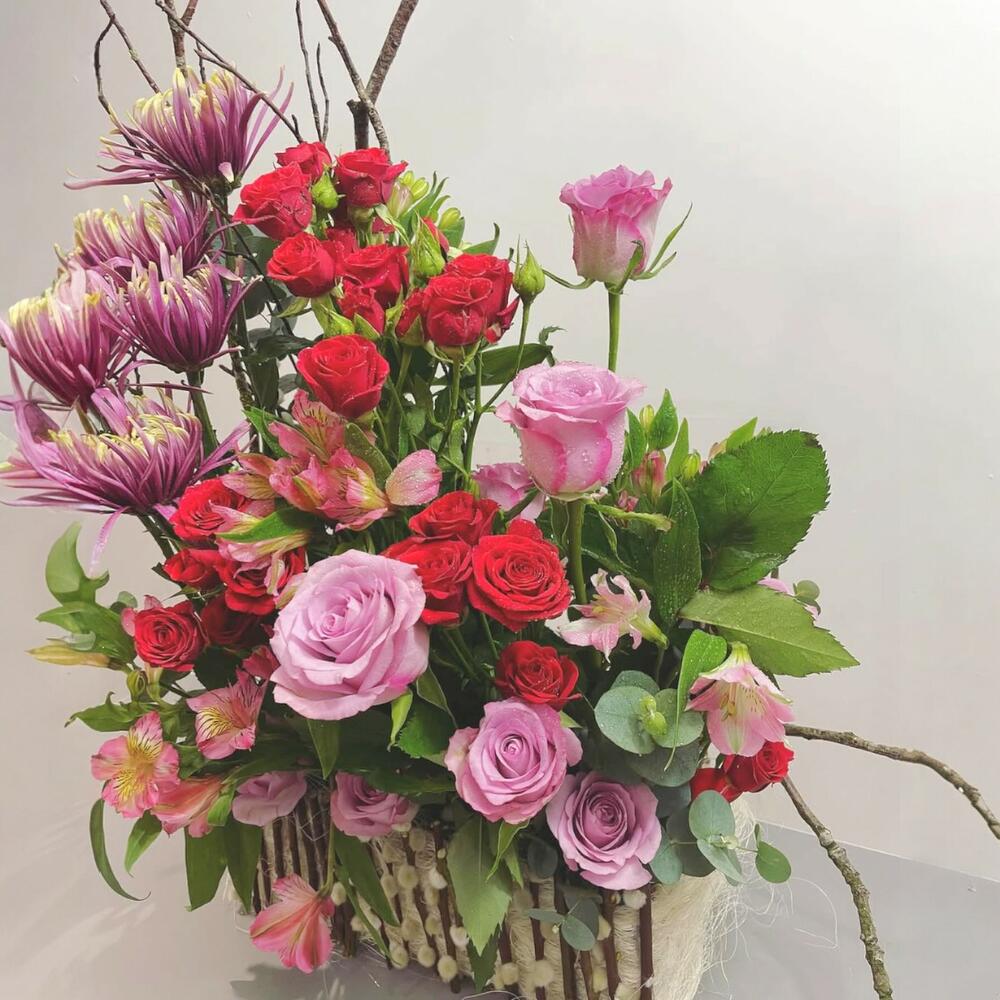 spider chrysanthemums - 4 pcs alstroemeria (pink) - 5 pcs red spray roses - 12 pcs lavender roses - 4 pcs eucalyptus and mixed foliage - 6 pcs natural twigs for design - 3 pcs