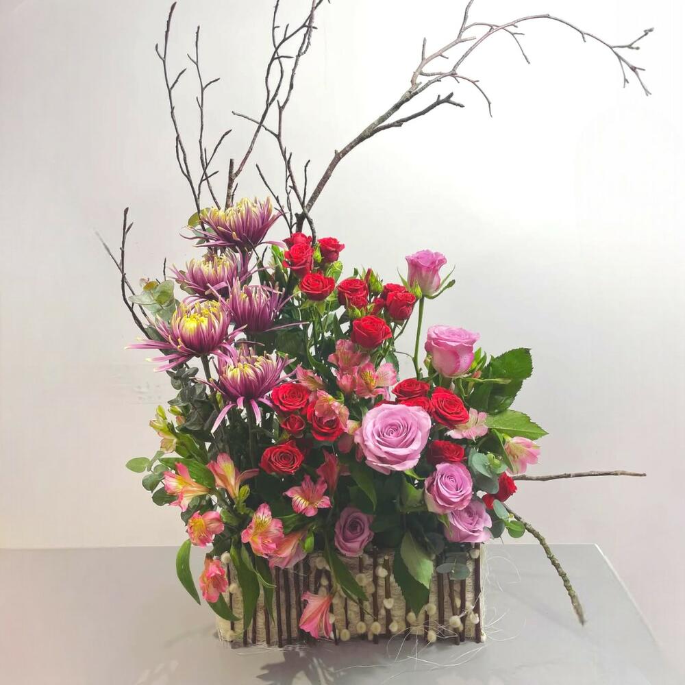 Bring a touch of woodland magic to your home with our Enchanted Garden Flower Arrangement. This stunning display is designed in a natural rustic wooden box, combining elegant pastel roses, bold red spray roses, exotic alstroemeria, and unique spider chrysanthemums. Finished with decorative branches for a wild, artistic flair, this floral piece is perfect for gifting or elevating home décor with a sophisticated and organic charm. Keep the arrangement in a cool room, away from direct sunlight and heating sources. Add water to the floral foam every 1–2 days to keep the flowers fresh. Avoid placing the design near fruit or in a draft to extend bloom longevity. The branches are decorative and should remain dry.