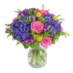 Solidago - 5 pcs yellow craspedia - 5 pcs purple hydrangeas - 5 pcs purple freesia - 5 pcs pink roses - 7 pcs