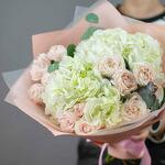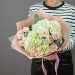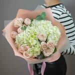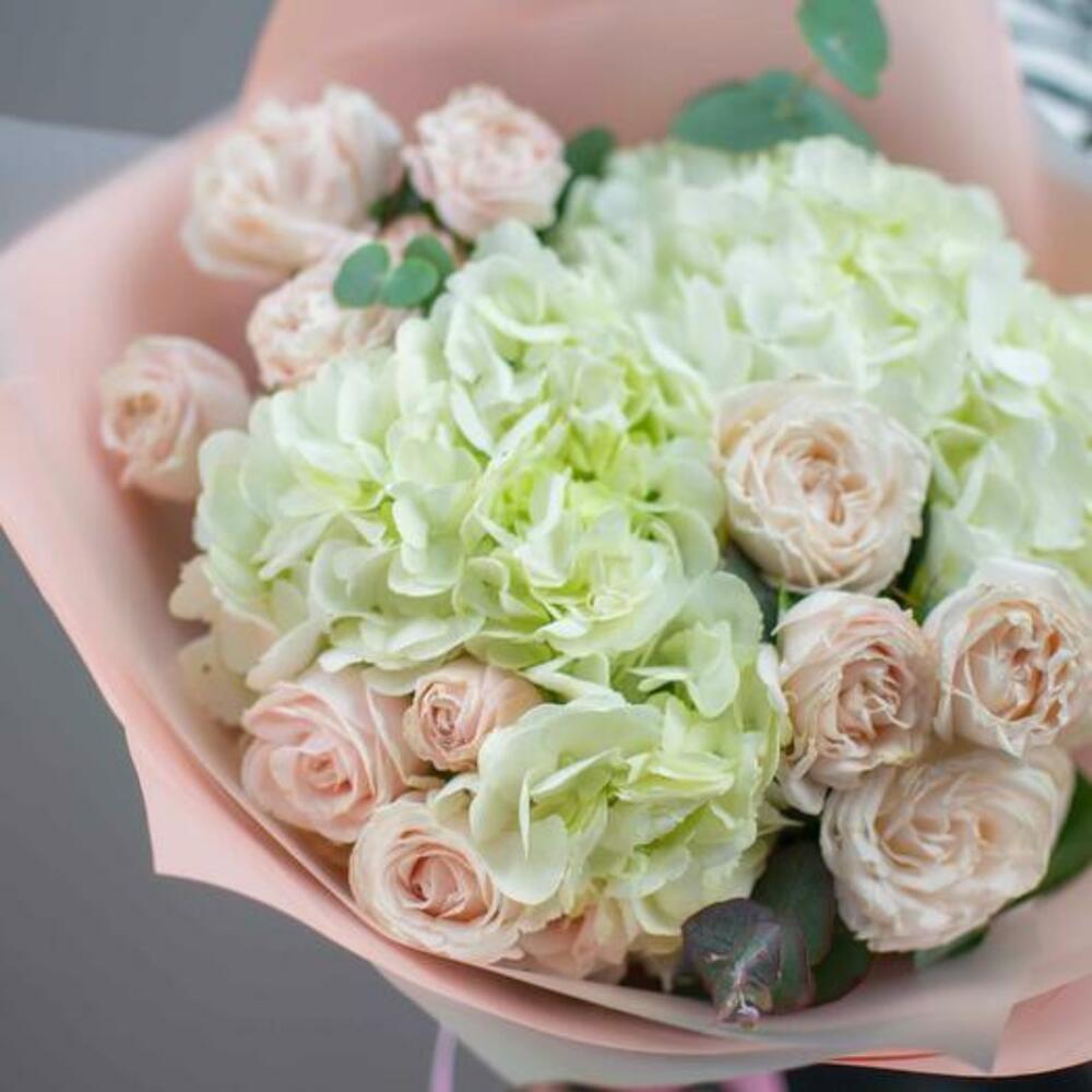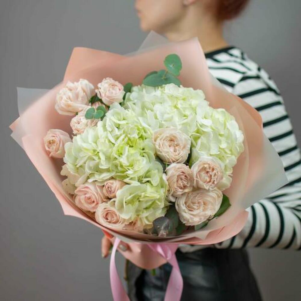 Eucalyptus - 1 pcs Hydrangea - 3 pcs design packaging - 1 pcs spray peony roses - 3 pcs