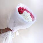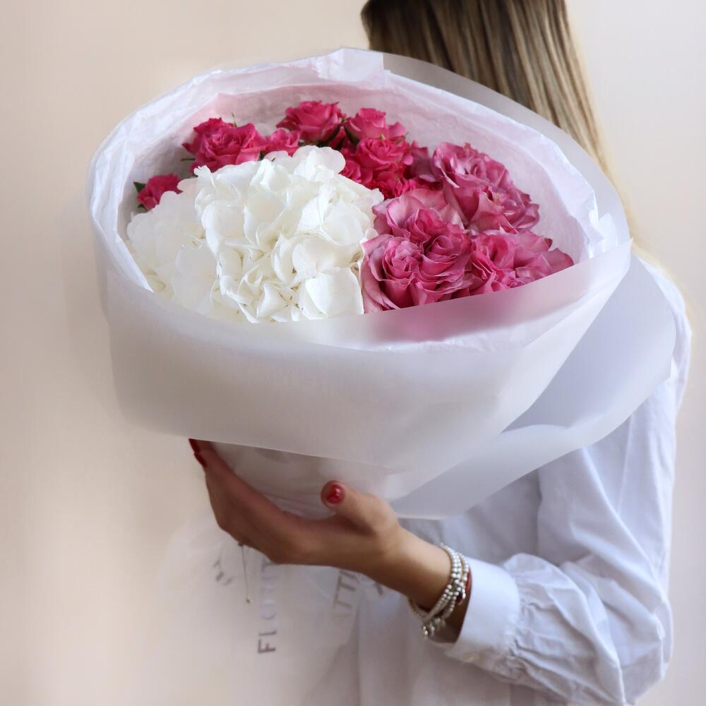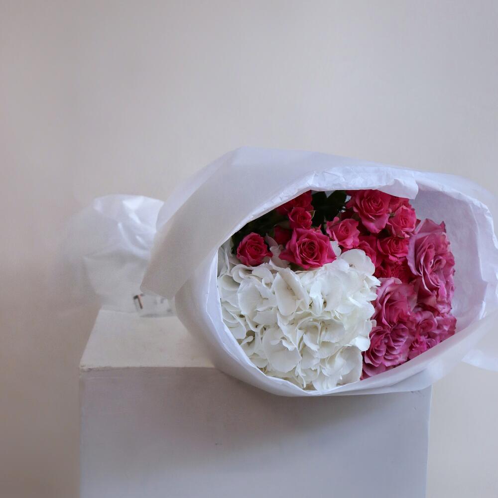 This exquisite bouquet embodies sophistication and tenderness, featuring a lush cluster of pristine white hydrangeas alongside vibrant pink roses. The contrast between the creamy whites and deep pinks creates a striking visual harmony, symbolizing balance and beauty. Wrapped in soft, elegant paper, this arrangement radiates understated luxury, making it a perfect choice for expressing love, gratitude, or admiration.