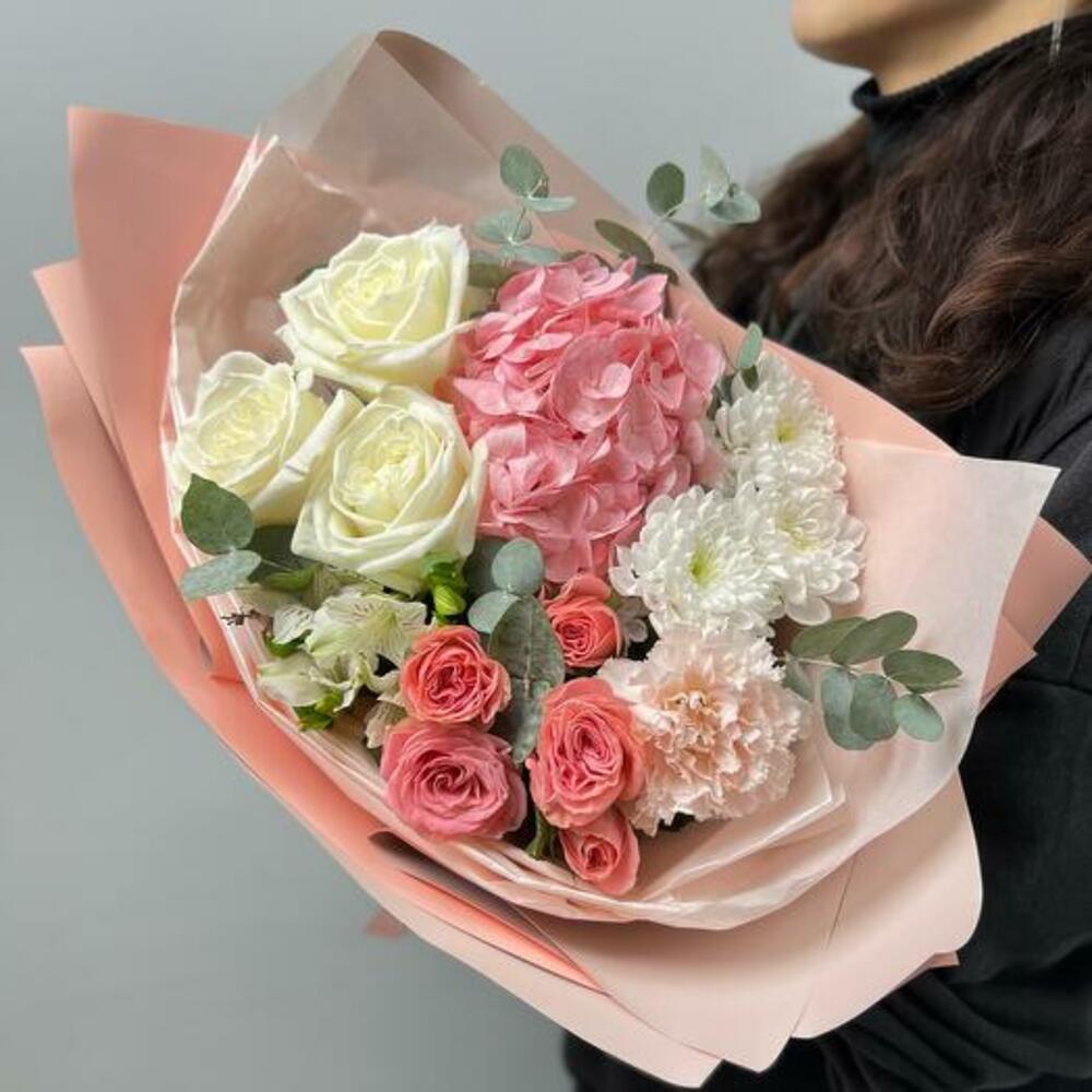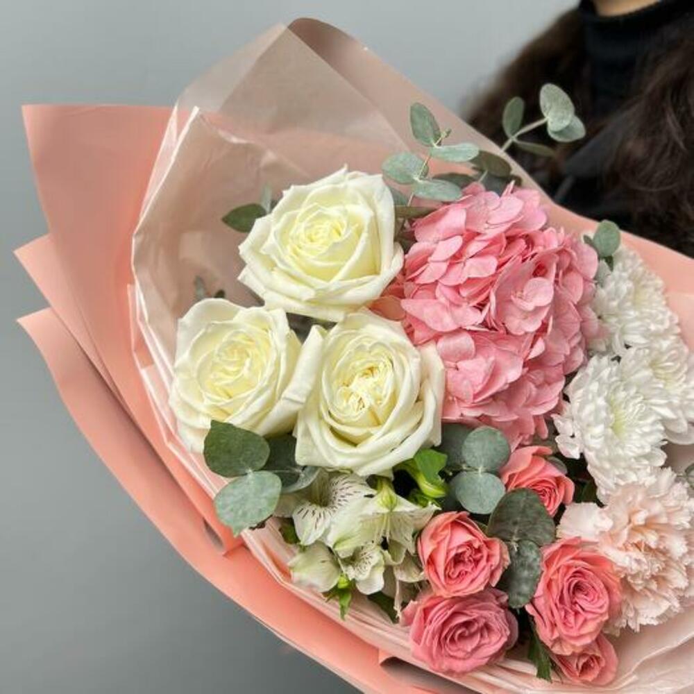 Eucalyptus - 3 pcs Hydrangea - 1 pcs Alstroemeria - 1 pcs White rose - 3 pcs chrysanthemum bush - 1 pcs packaging - 1 pcs dianthus - 1 pcs peony spray rose - 1 pcs