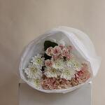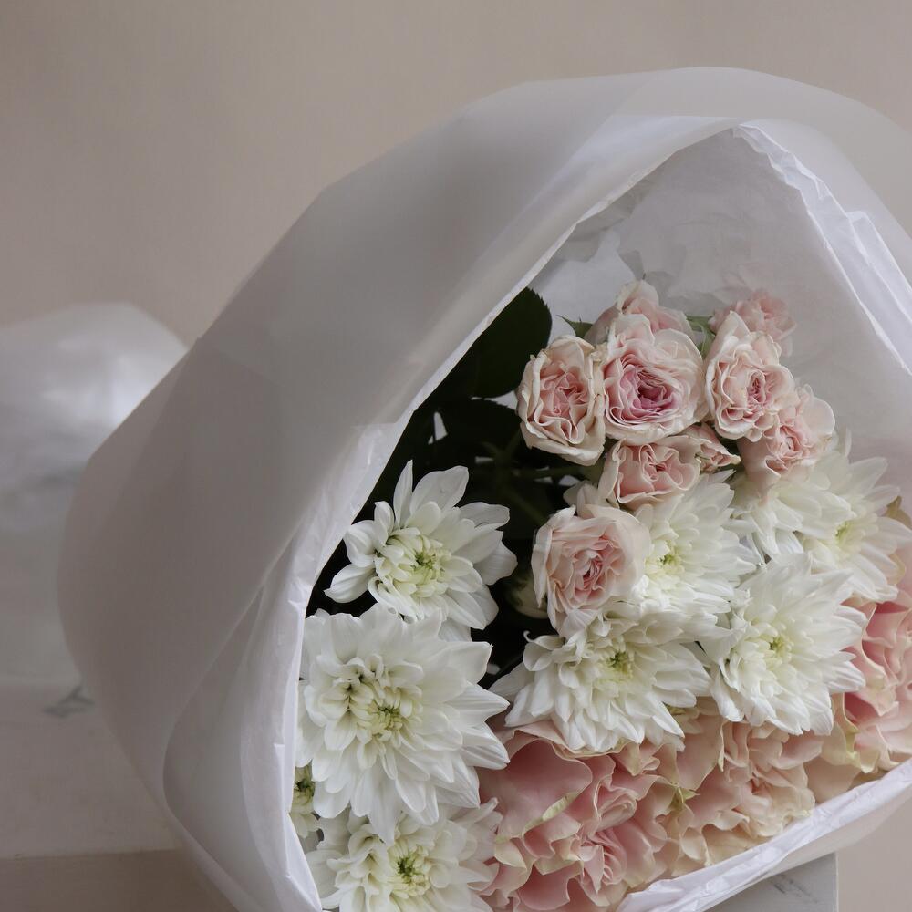 An exquisite blend of creamy white chrysanthemums and pale pink roses, wrapped in translucent white paper. The bouquet’s minimalist design and pastel hues create an ethereal aesthetic, perfect for expressing admiration, gratitude, or love with effortless sophistication.