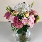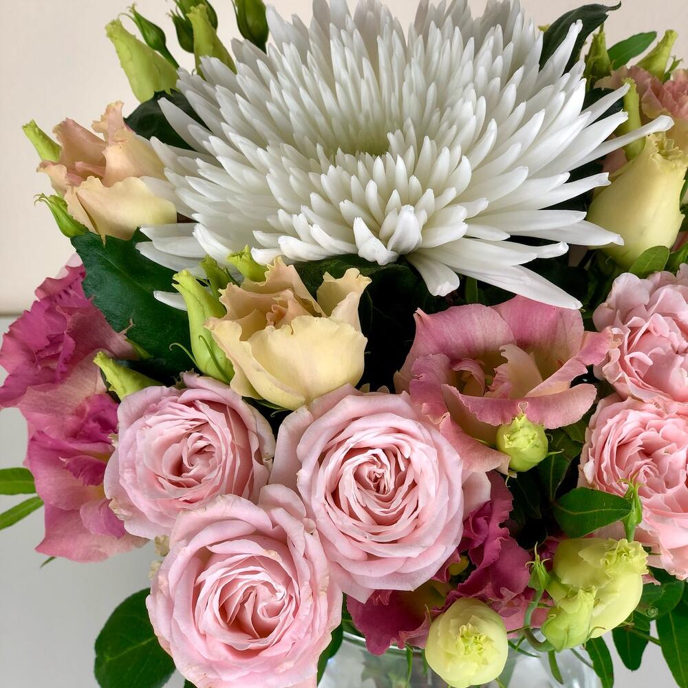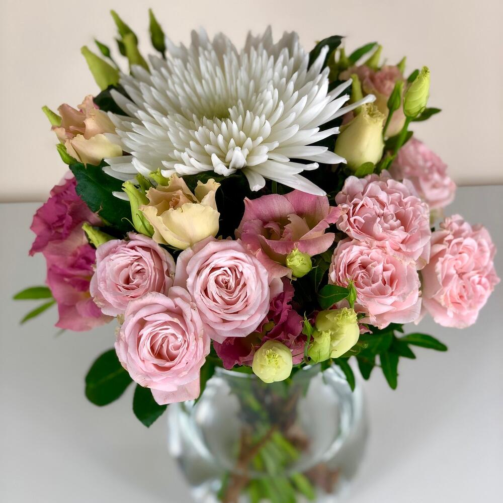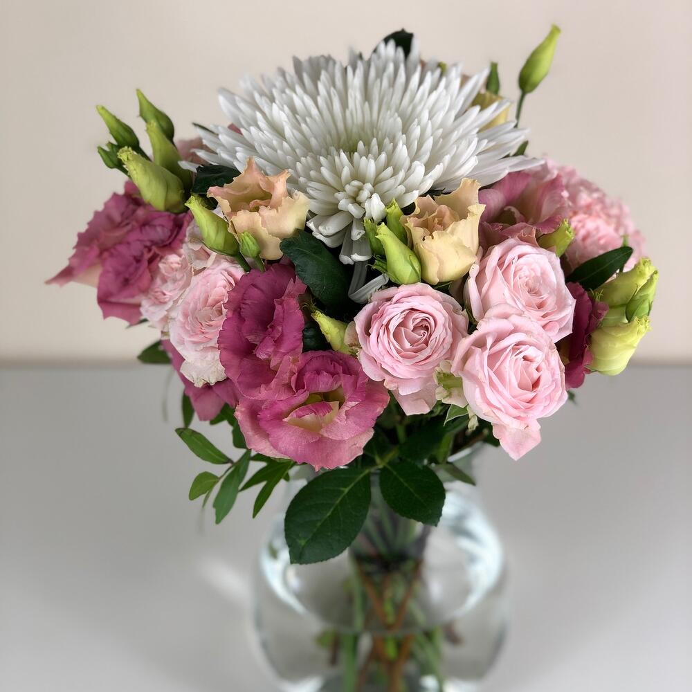 Pink rose - 2 pcs Vase - 1 pcs white chrysanthemum - 1 pcs pink lisianthus - 2 pcs