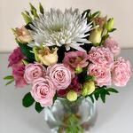 Looking for a bouquet that's both elegant and understated? Look no further than Evelyn with Pink rose, White chrysanthemum, and Pink lisianthus. This gorgeous arrangement features the soft beauty of pink roses, the purity of white chrysanthemums, and the delicate charm of pink lisianthus. Perfect for any occasion, from weddings and anniversaries to birthdays and thank yous, Evelyn is a timeless choice that will never go out of style. So why wait? Order your Evelyn bouquet today and let its simple yet sophisticated beauty take your breath away!