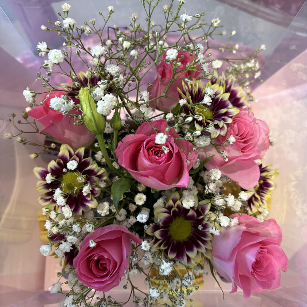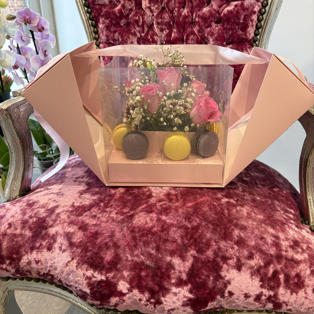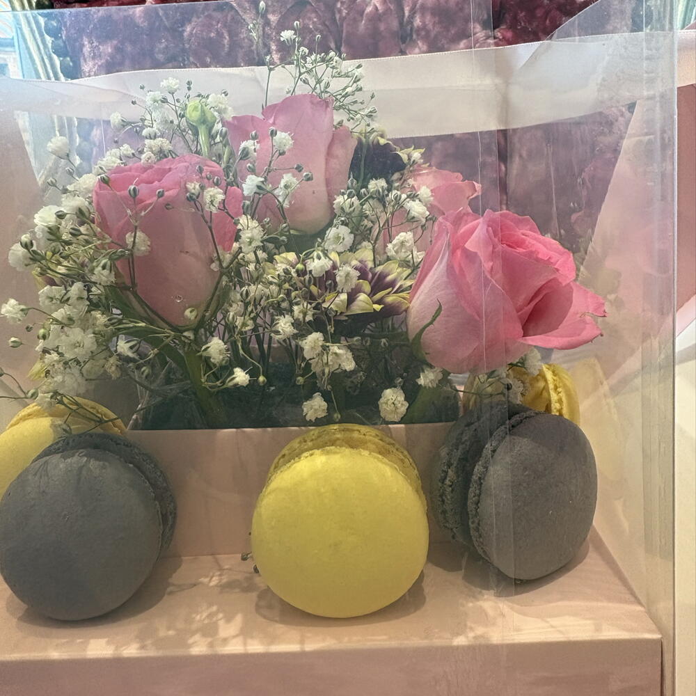 macaroons - 10 pcs gypsophila white - 5 pcs spray chrysanthemums - 5 pcs roses - 5 pcs