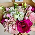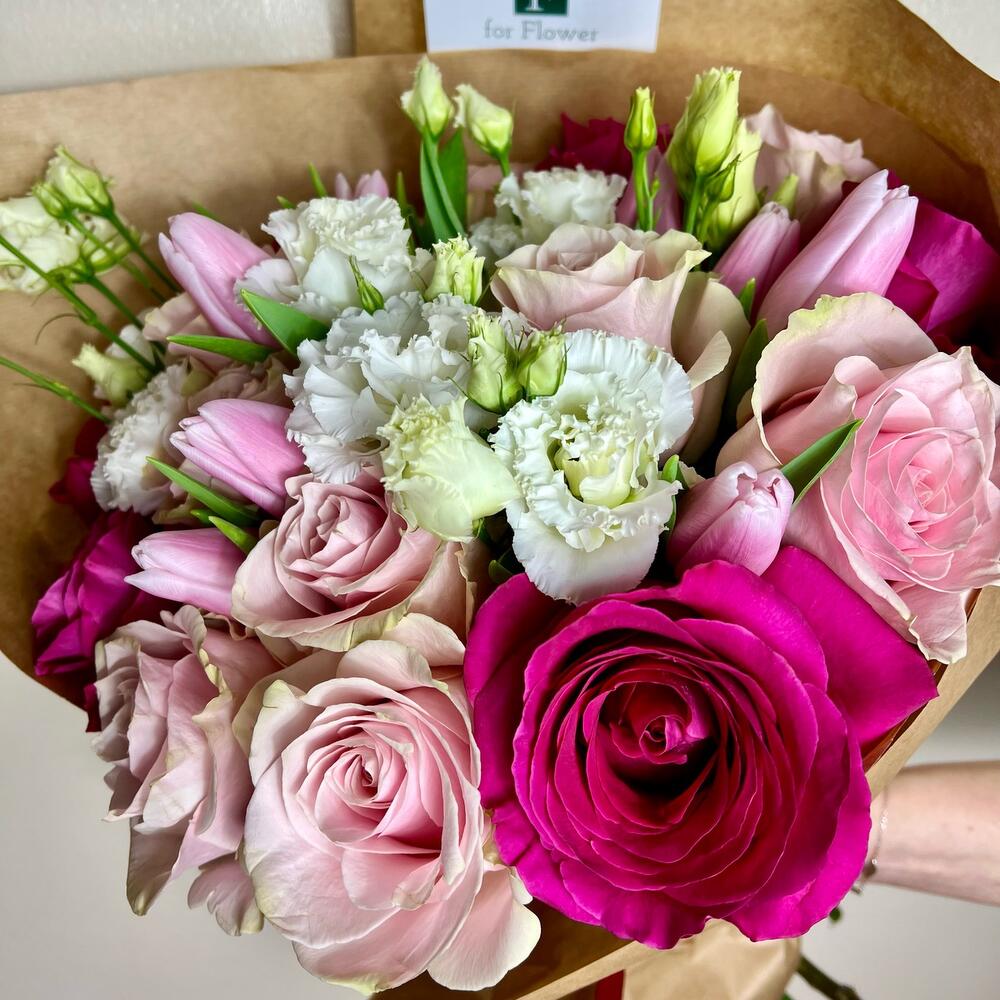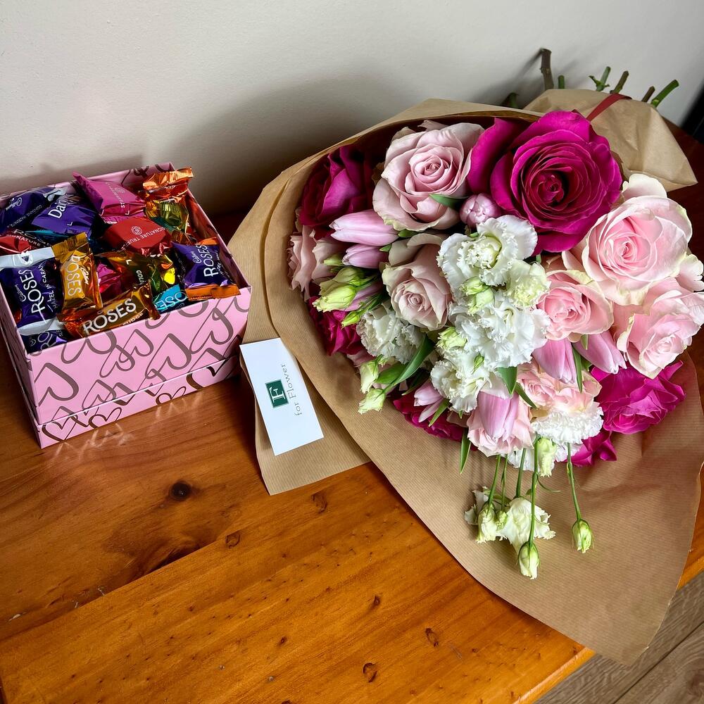 This flower wrap is a mixture of fuchsia and light pink roses, pink and white lisianthus and pink tulips. Its comes with a box of cadbury roses chocolates.