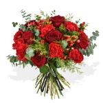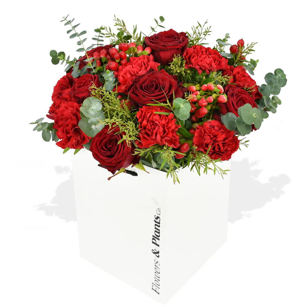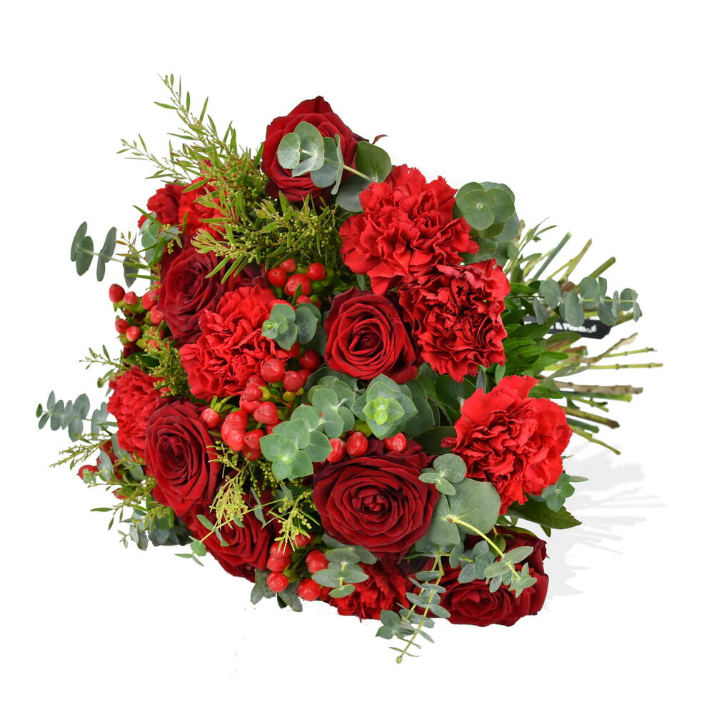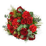 Overflowing with brilliant red roses, carnations, and seasonal hypericum berries, this arrangement is perfectly accented by fragrant eucalyptus. Give the gift of beauty and fragrance with Festive Reds.