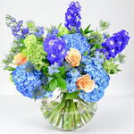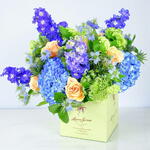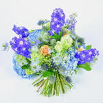 A delightful bouquet containing some of the best freshly picked seasonal British flowers. In combining the rich tones of blue delphiniums and hydrangeas with peach roses and some of the best flower fillers available, our florists have created a bouquet that will delight any time it is sent out.