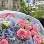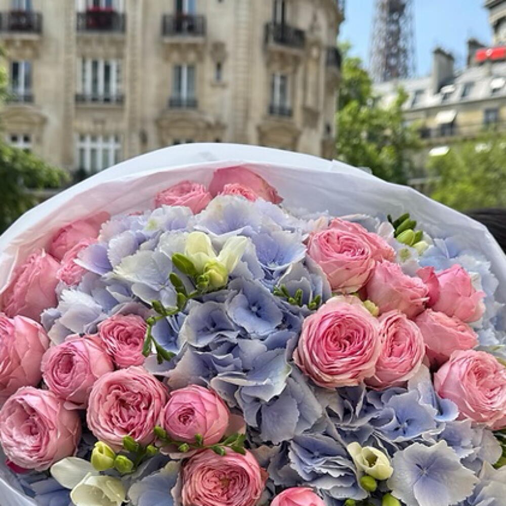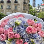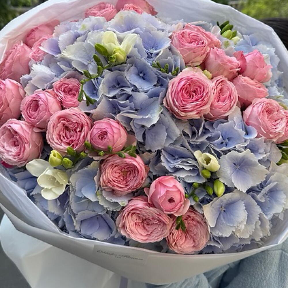blue hydrangeas - 5 pcs pink spray roses - 10 pcs white fressia - 5 pcs