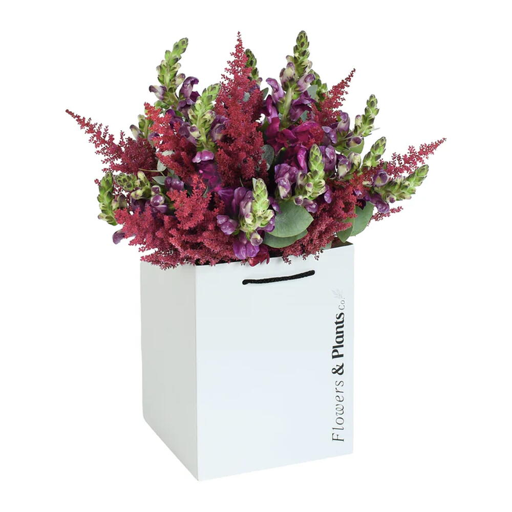 Tall, striking burgundy snapdragons and rich deep pink astilbe come together in a bouquet that feels bold and wildly beautiful. An arrangement with real presence — for someone who appreciates flowers with genuine drama.