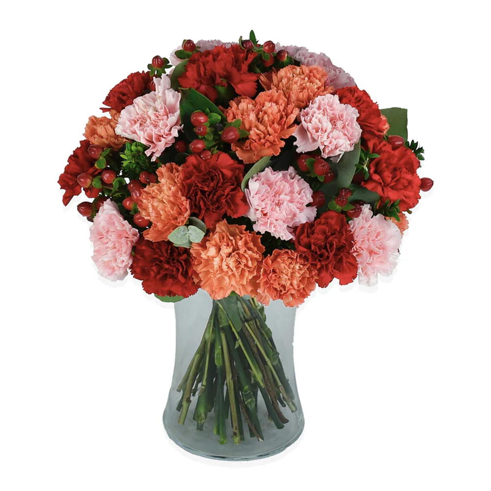 Carnations in blazing shades of pink, red and orange come together in a palette that is vivid, powerful and full of energy. Deep red hypericum berries punctuate the arrangement with a rich, jewel-like intensity that adds real drama and depth.