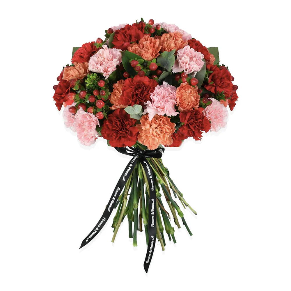 red hypericum - 15 pcs seasonal foliage (bunch) - 1 pcs mixed colour carnations - 45 pcs