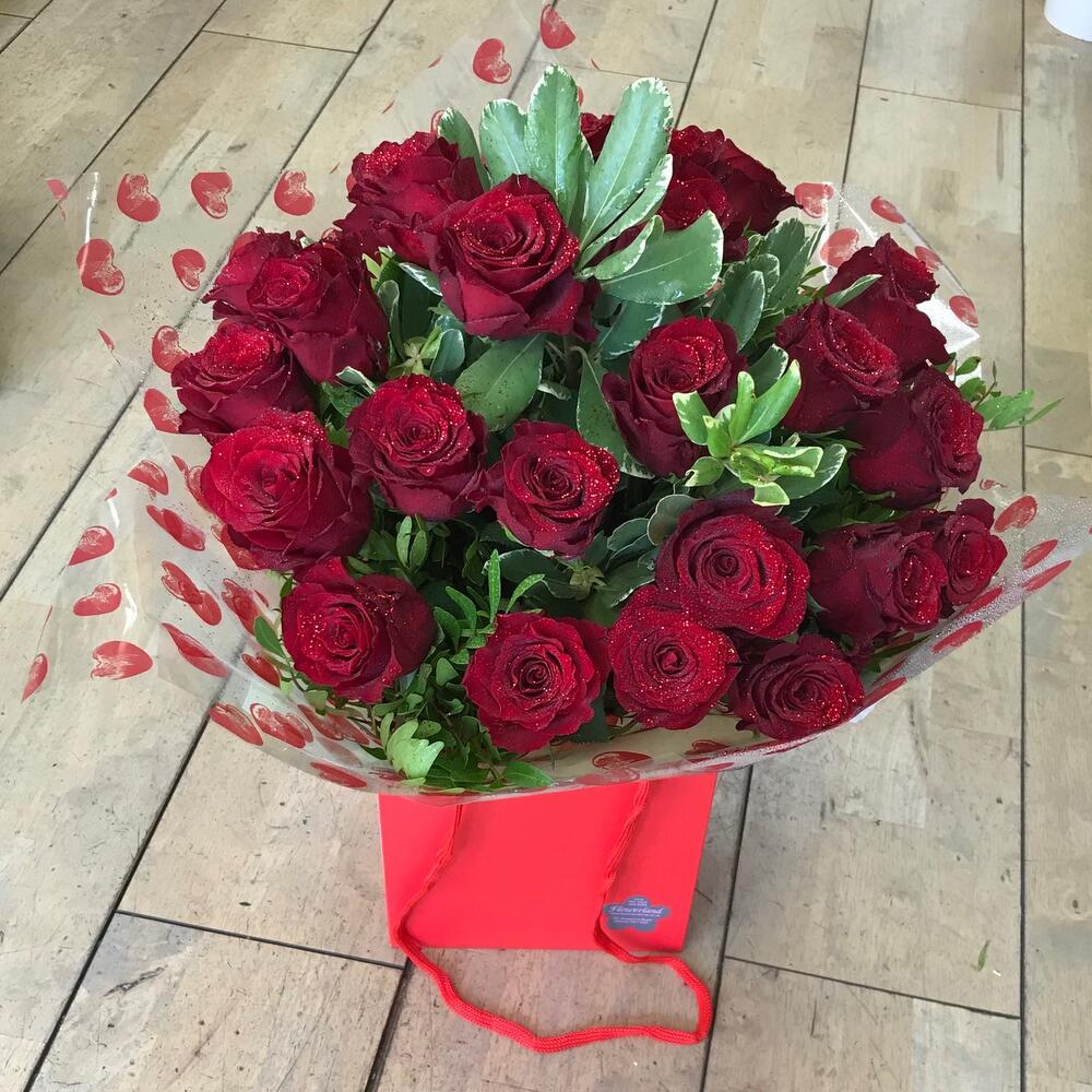 12 red roses handtied presented in a bag