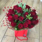 Red rose - 12 pcs Salal - 6 pcs Pistacia - 5 pcs palm leaves - 3 pcs eucalyptus leaves - 3 pcs