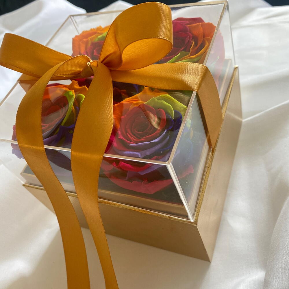 4 piece of beautiful preserved roses in golden square box suitable for any occasion:wedding,baby shower,birthday, etc