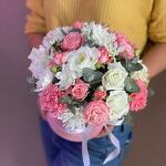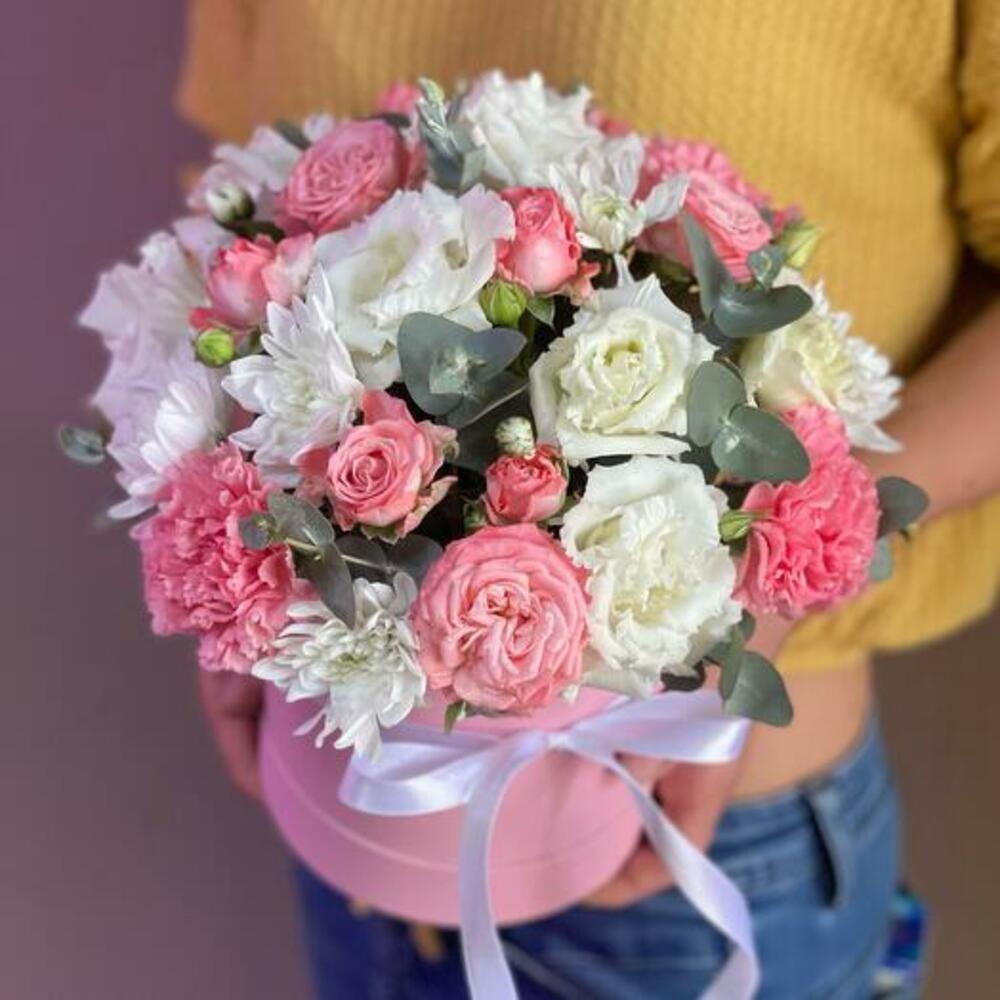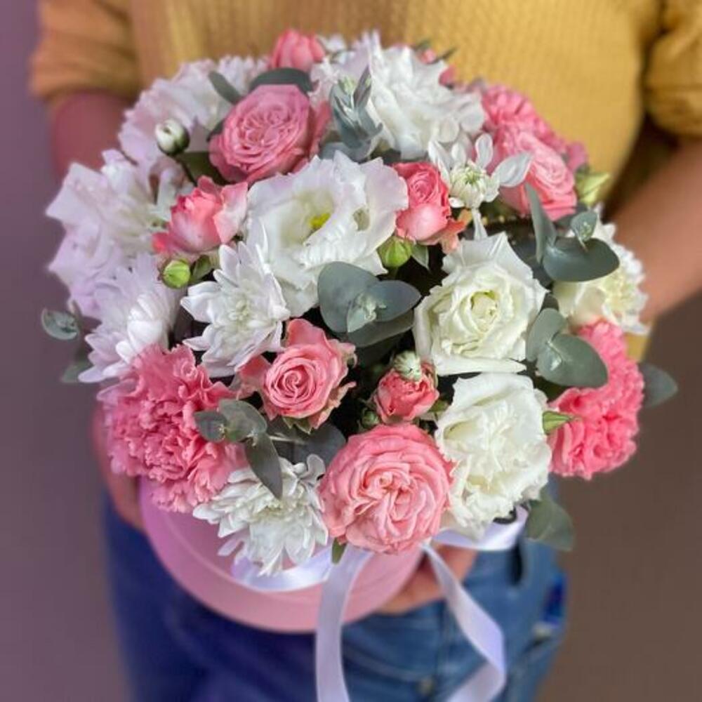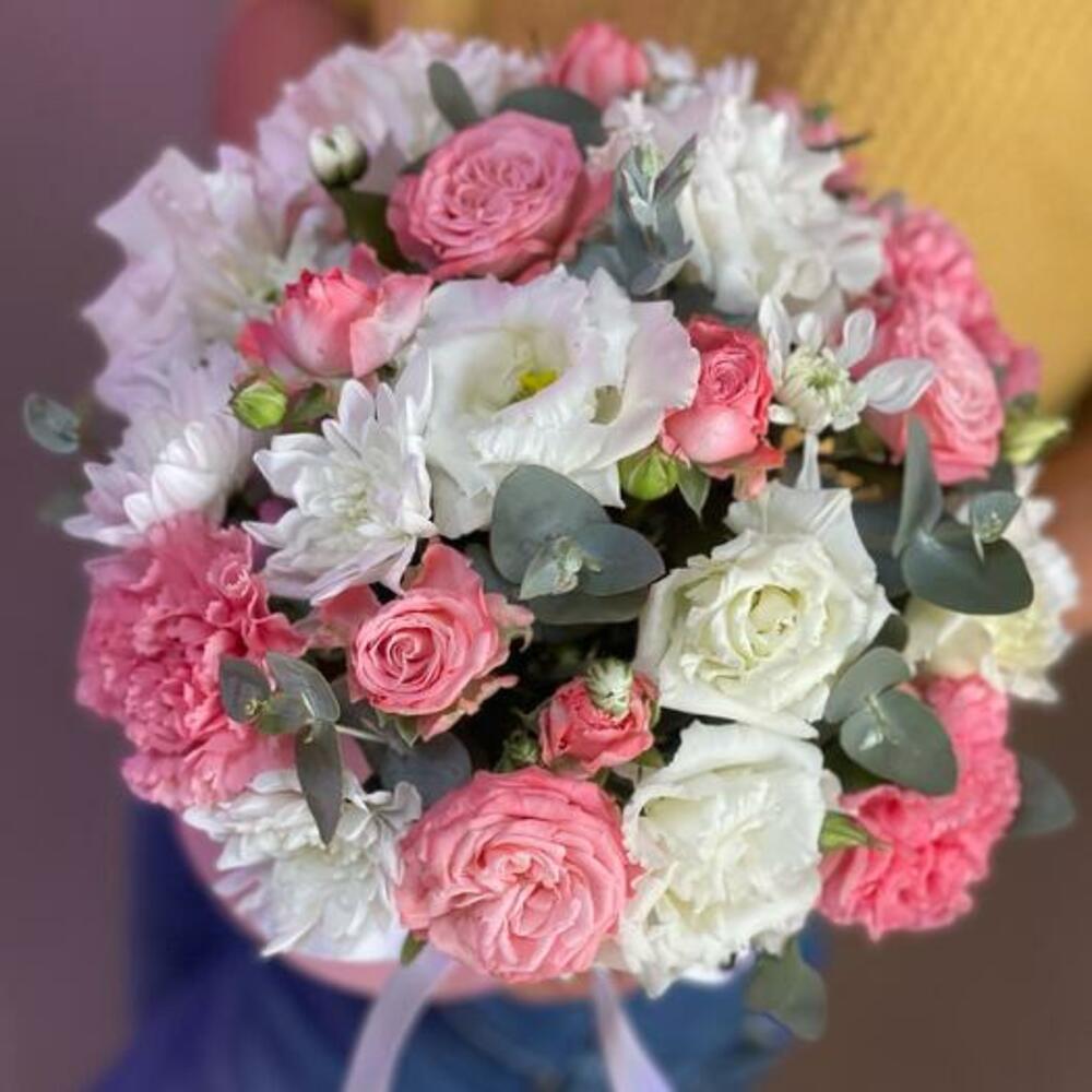 Eustoma - 3 pcs Satin ribbon - 1 pcs Eucalyptus - 2 pcs Hatbox - 1 pcs chrysanthemum bush - 1 pcs dianthus - 3 pcs peony spray rose - 3 pcs floral oasis - 1 pcs