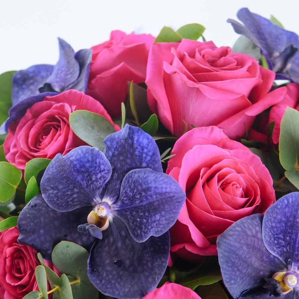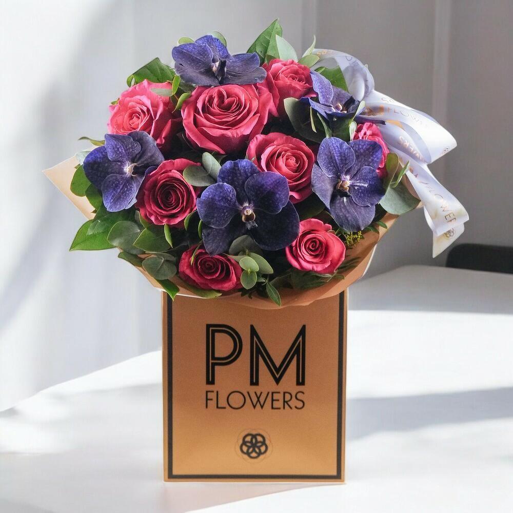 Experience the elegance of “Flutter” – a contemporary bouquet that perfectly blends the bold beauty of purple vanda orchids with the romantic charm of cerise pink roses. Accented with fresh eucalyptus for a hint of wild texture, this arrangement is as graceful and unique as a butterfly in motion. Designed in a luxury PM Flowers gift box, this bouquet is the perfect expression of modern romance, elegance, and style. Whether you’re celebrating love, sending thanks, or gifting a moment of beauty, “Flutter” is a captivating floral choice that’s unforgettable. Care Instructions: Keep this floral arrangement in a cool room away from direct sunlight and heating sources. To extend freshness, top up the water in the box daily or transfer to a vase with clean water, trimming stems slightly at an angle. Avoid overcrowding to let the orchids breathe and fully open.