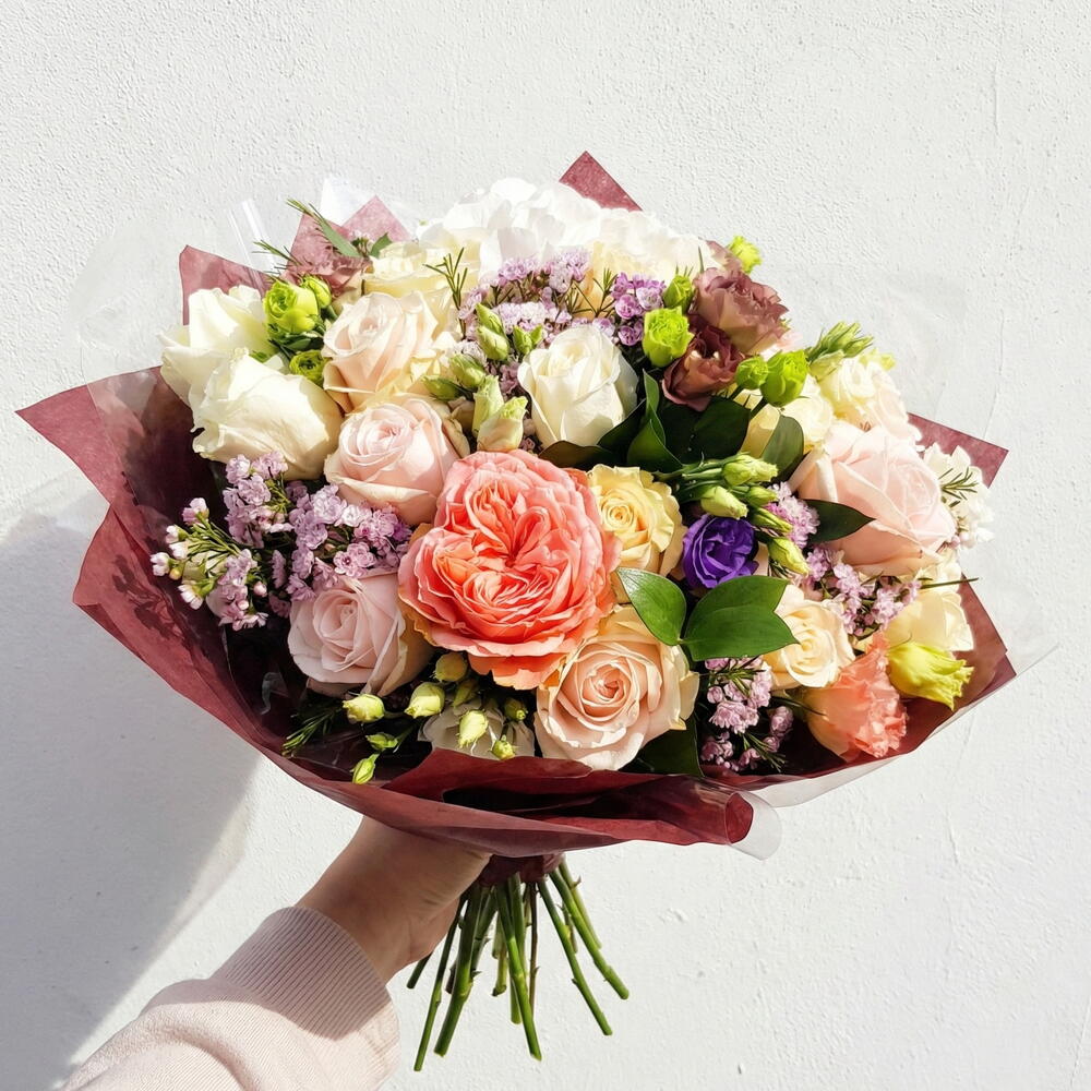 spray roses (cream) - 3 pcs lisianthus (purple) - 5 pcs garden rose (peach) - 3 pcs statice or wax flower (lavender) - 4 pcs ranunculus or seasonal accent bloom - 2 pcs premium roses (peach & cream) - 9 pcs