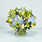 forget me not - 8 pcs blue hydrangeas - 4 pcs green lisianthus - 8 pcs bupleurum - 4 pcs white spray roses - 8 pcs yellow ranunculus - 8 pcs buttercup roses - 8 pcs seasonal greenery (bunch) - 1 pcs