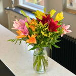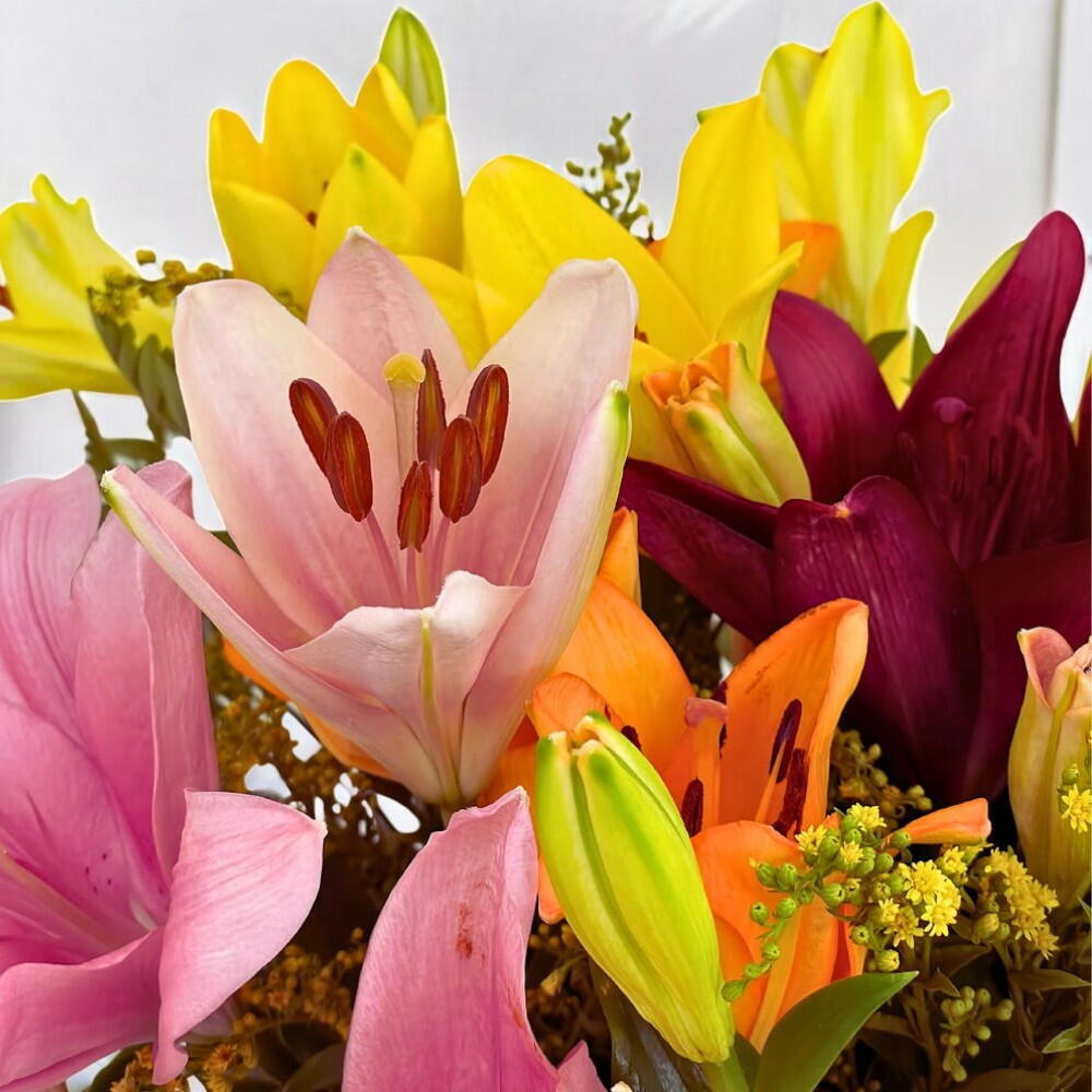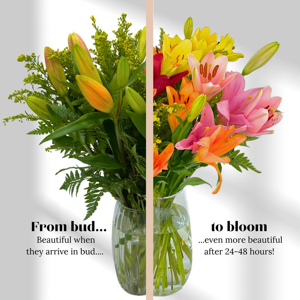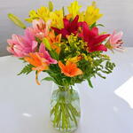 This beautiful bouquet features an array of vibrant lilies in shades of pink, orange, yellow, and red, making it a perfect burst of color for any space. The bold and lively colors are complemented by delicate green accents, creating a balanced and cheerful arrangement. Ideal for brightening up a room or as a thoughtful gift for a loved one, these lilies symbolize purity, passion, and celebration. The fresh greenery enhances the overall look, adding a natural touch to the vibrant flowers. Presented in a clear vase, this bouquet exudes elegance and freshness. It’s perfect for birthdays, anniversaries, or simply bringing joy to someones day. Let the beauty and energy of these lilies fill your home with positivity!