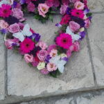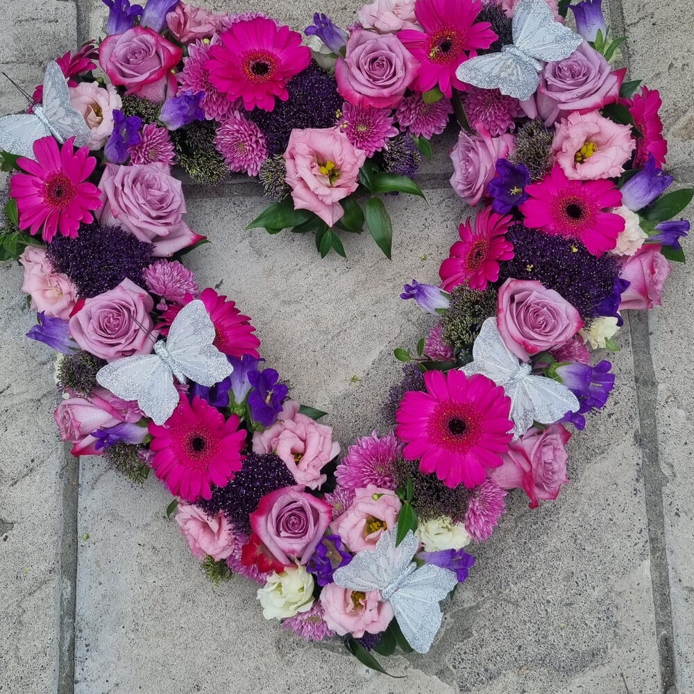 Name Fuchsia heart fuchsia is a meaningful tribute , a mixture of seasonal flowers ,suitable for a funeral or meaningful remembrance, we can create a bespoke tribute, let us know you choose flowers or colours. with or without the butterflies. colour Neutral, Pastel ,bright approximate product dimensions length 52cm width 50 cm high l5cm Delivery kansiyfloral will make sure your tribute arrives where and when it should. cooperating with the funeral director.