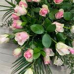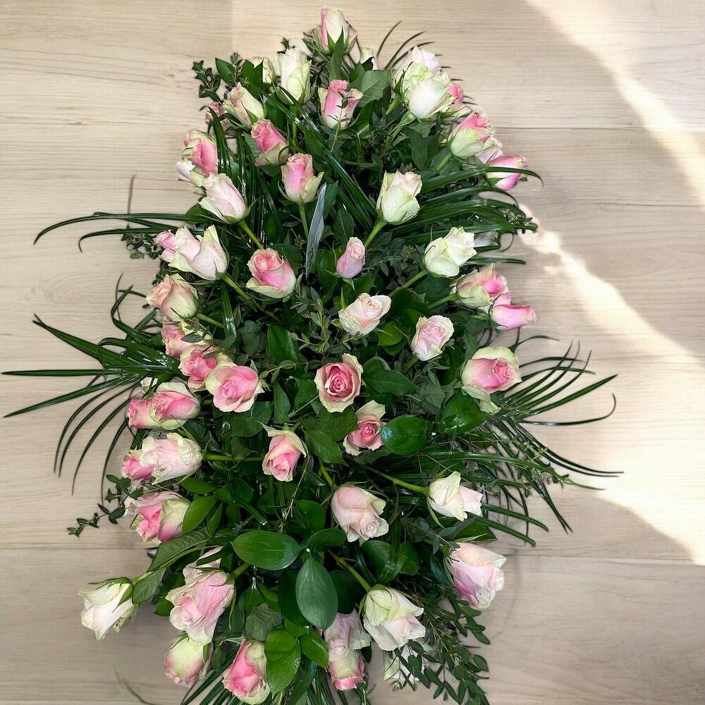 Graceful Farewell Coffin Spray – Pink Roses Lush Greenery